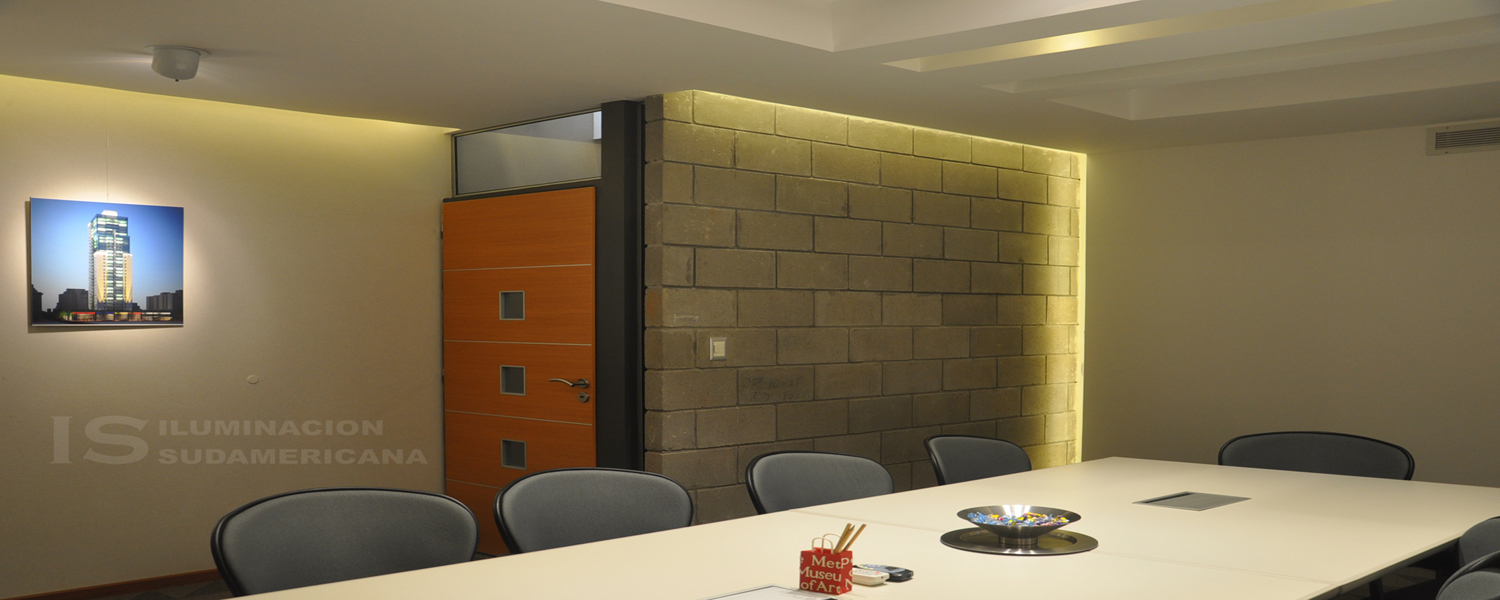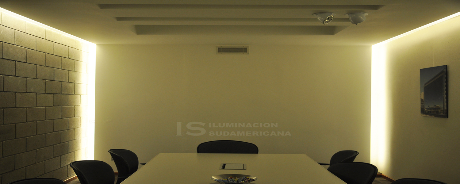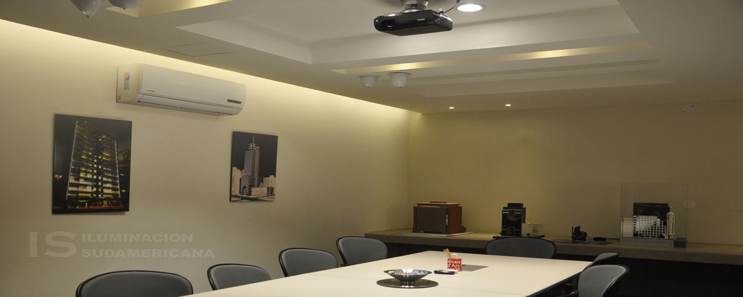 En la sala de reuniones se ha creado un espacio que contempla distintas escenas posibles en un mismo ambiente. En los laterales como iluminación indirecta se generaron gargantas con tecnología LED que acompañan la oscuridad necesaria a la hora de realizar proyecciones, como así también le otorgan calidez al espacio. Para el plano de trabajo se busco una iluminación homogénea de 500 lux que cumplen con las normativas ideales para estos sectores. Para finalizar como iluminación de desataque se trabajo con lámparas dicroicas de LED RIO y artefactos tipo codos con lámparas AR111 de LED RIO con CRI de 90